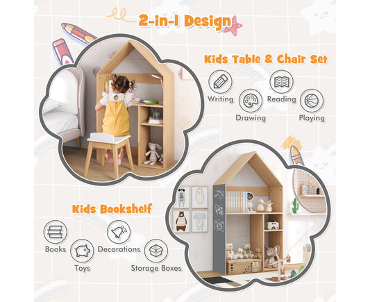 2-In-1 Kids House-Shaped Table and Chair Set Children Bookshelf Toy Storage Cabinet W/Blackboard